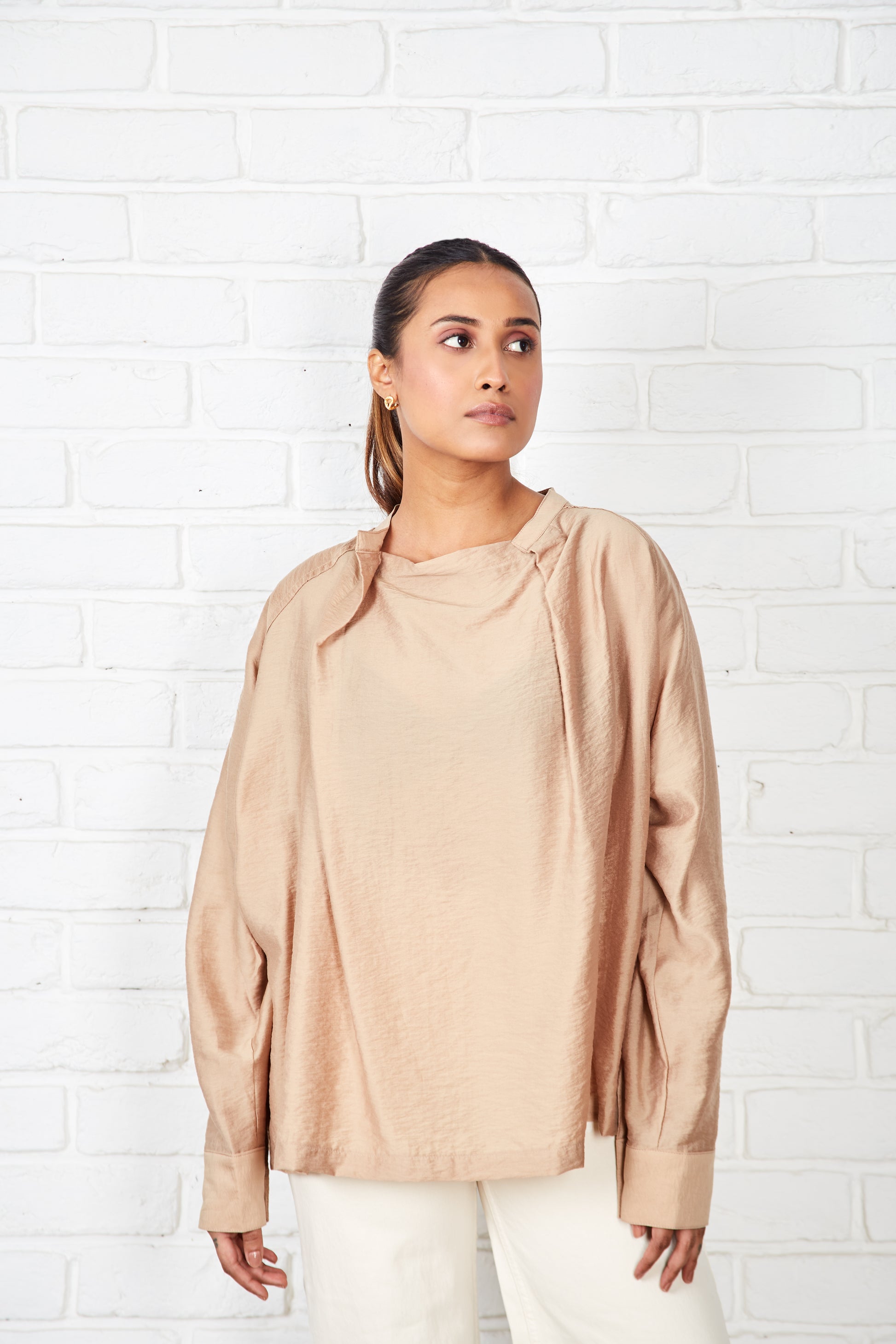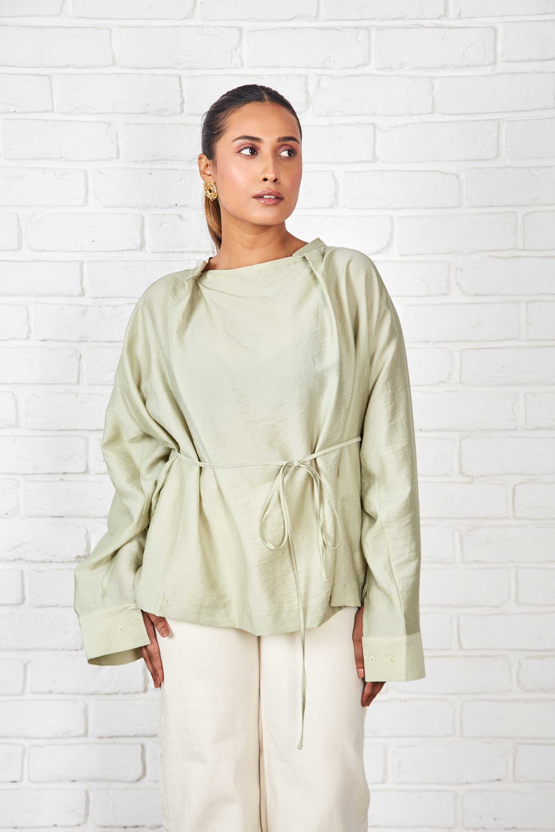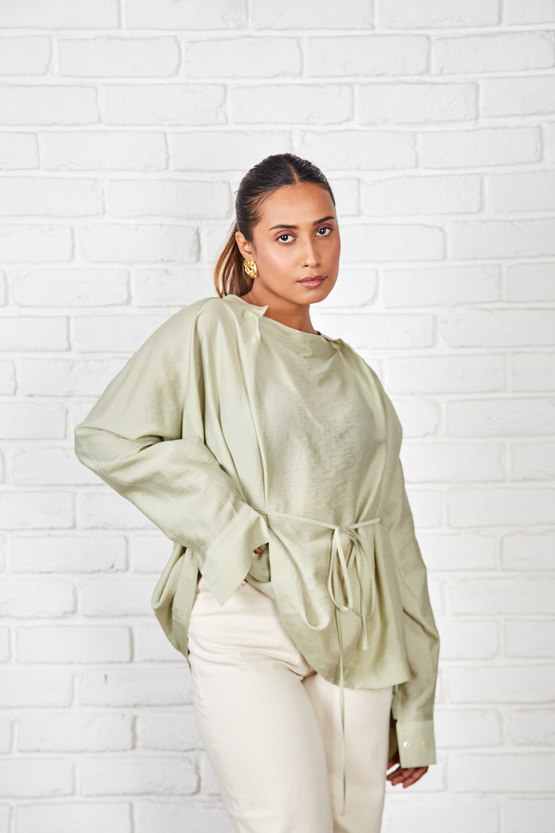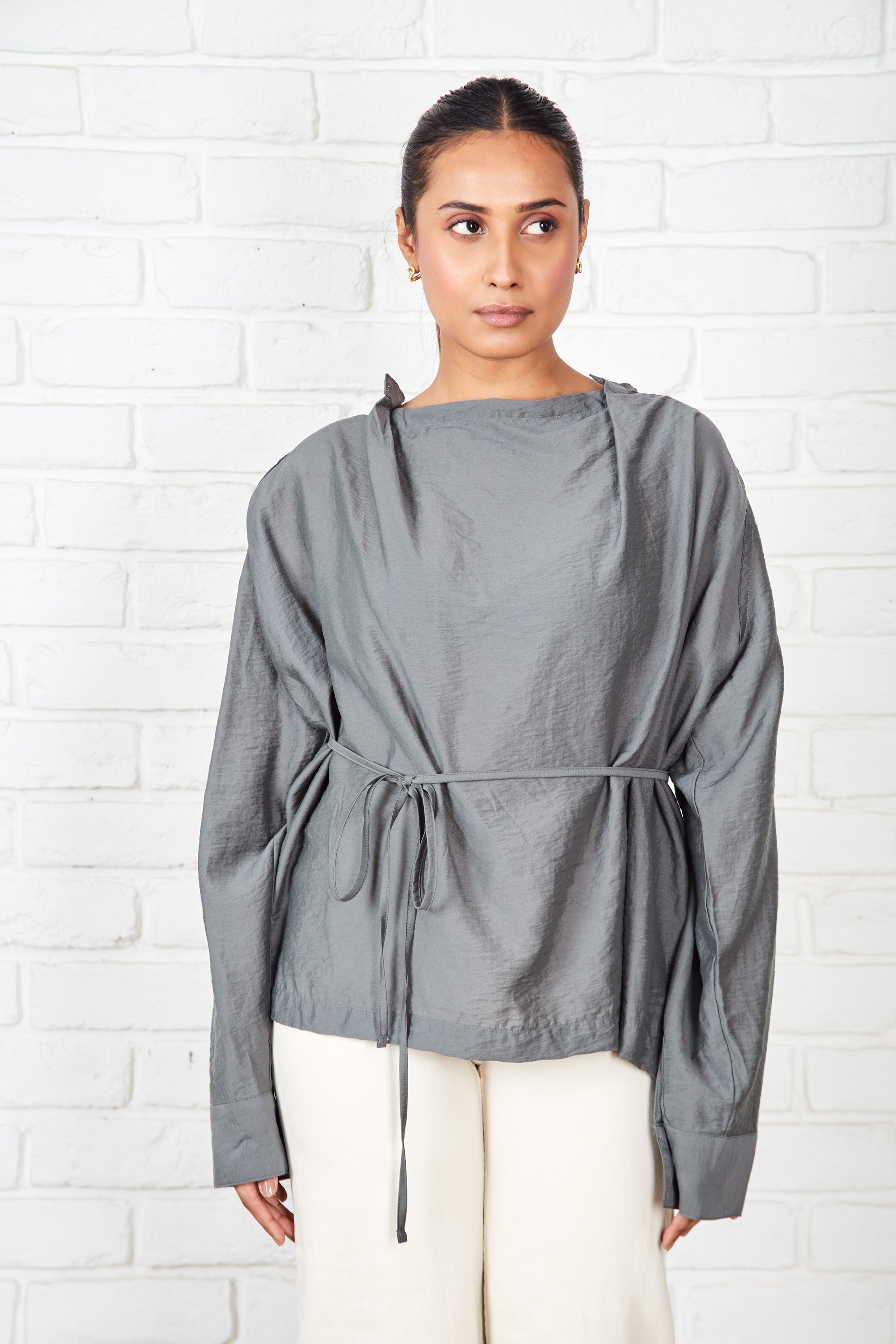This blouse, in a soft cotton-silk blend, features a garment-dyed finish for a smooth feel. Its versatile silhouette can be worn loose and flowing or gently cinched with a wraparound drawstring for a more defined shape. The neckline is thoughtfully designed with a centre panel under a buttonless placket, creating an artful trompe-l'œil effect that mimics a stand collar with a draped cowl neck.