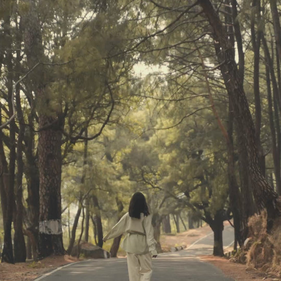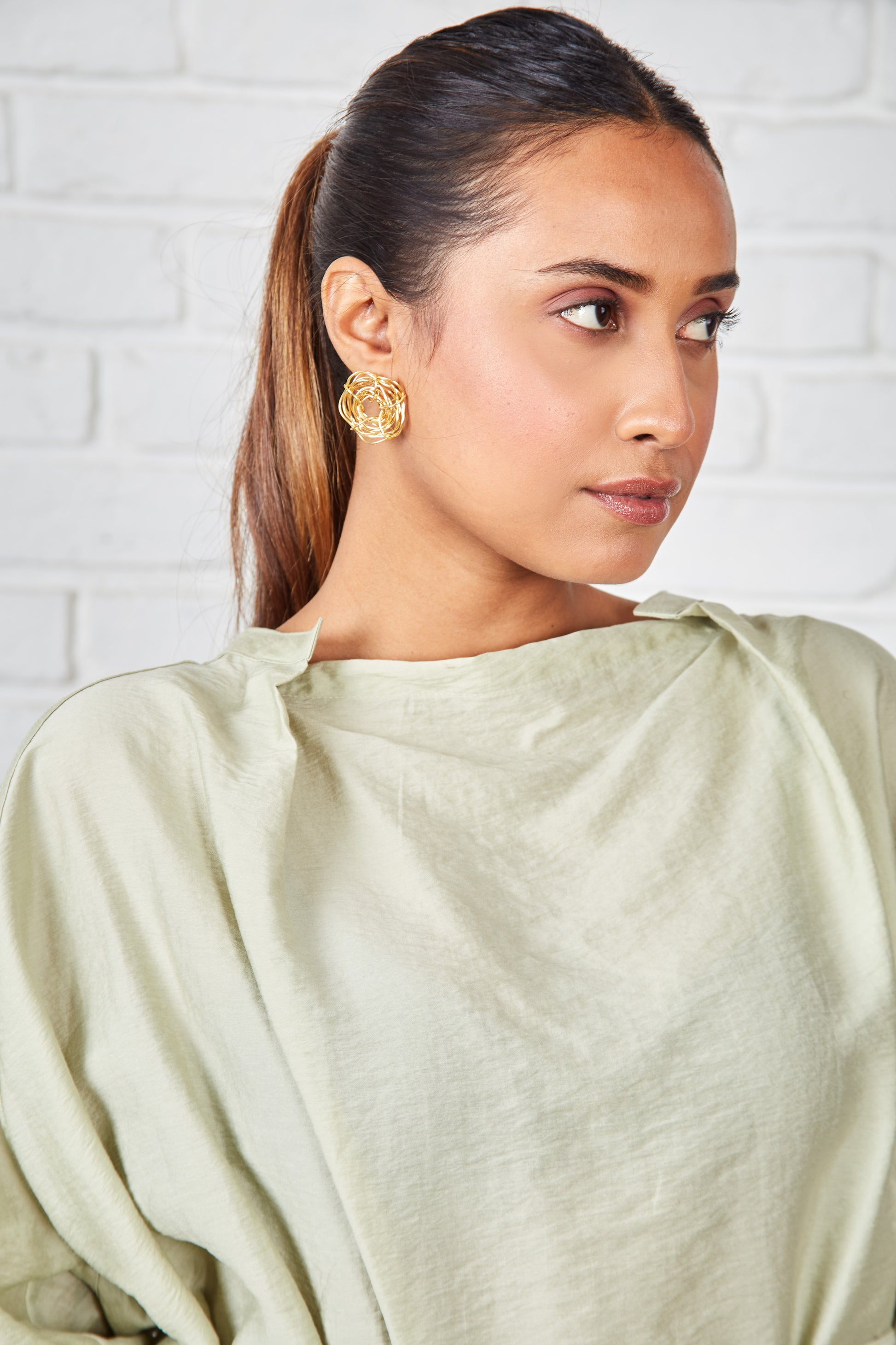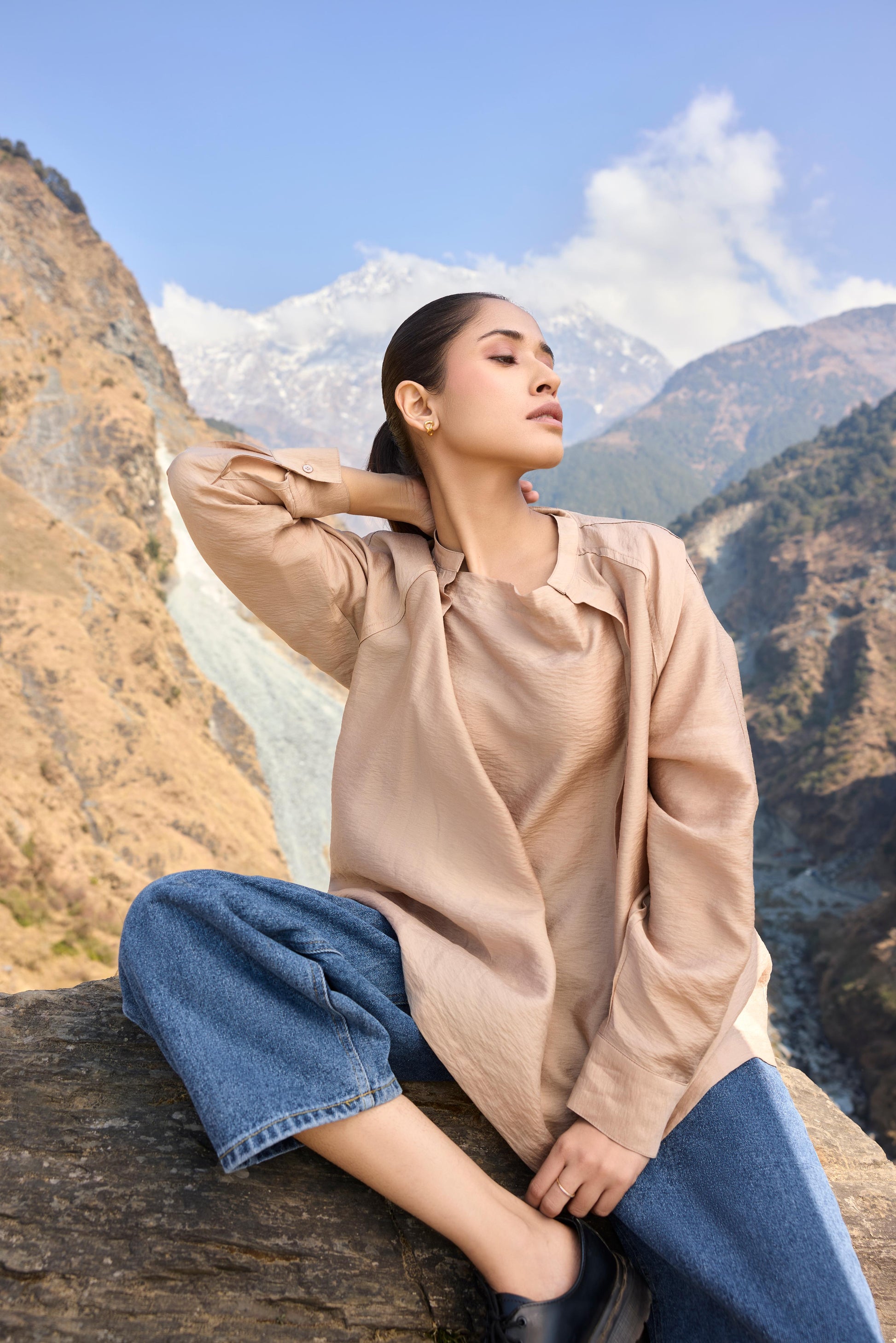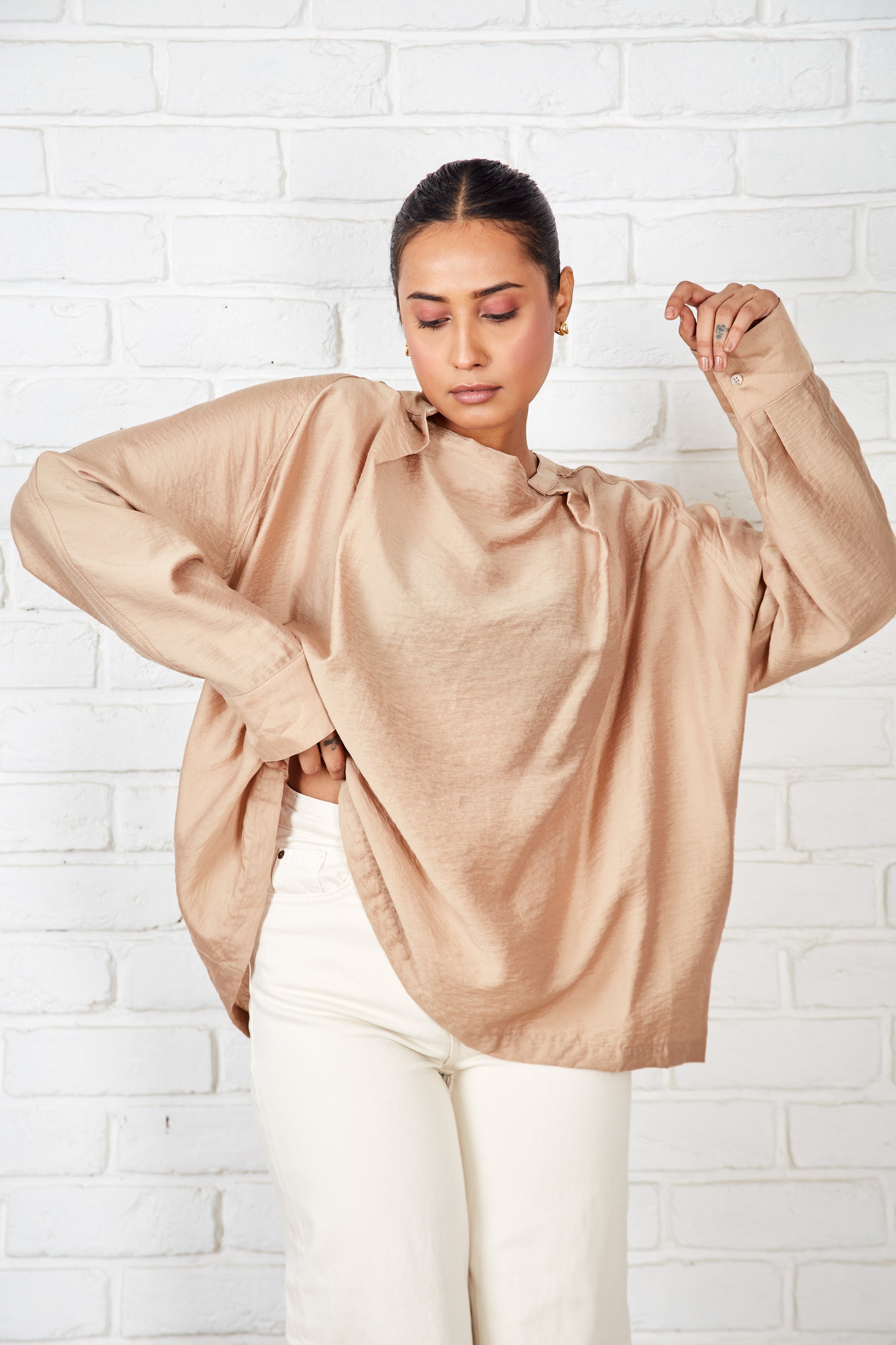 This blouse, in a soft cotton-silk blend, features a garment-dyed finish for a smooth feel. Its versatile silhouette can be worn loose and flowing or gently cinched with a wraparound drawstring for a more defined shape. The neckline is thoughtfully designed with a centre panel under a buttonless placket, creating an artful trompe-l'œil effect that mimics a stand collar with a draped cowl neck.