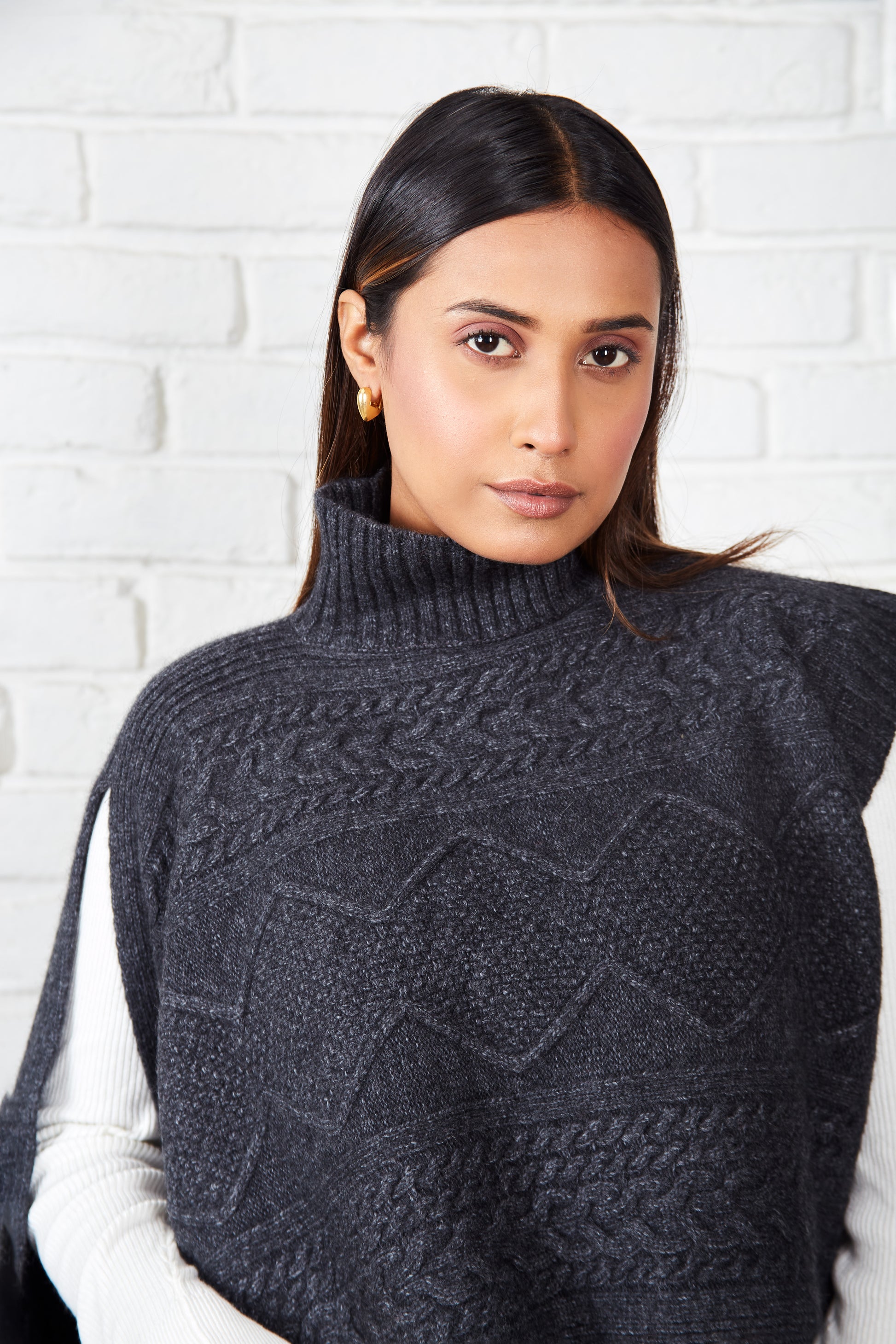 This luxurious poncho shawl, crafted from a blend of cashmere and baby alpaca wool, offers versatile styling with three distinct ways to drape it. Its asymmetrical silhouette is designed with a full sleeve slit on one side and a refined knot on the other. It features a braided design and a heavyweight ribbed turtleneck that drapes comfortably at the neck, delivering both warmth and an elegant silhouette.