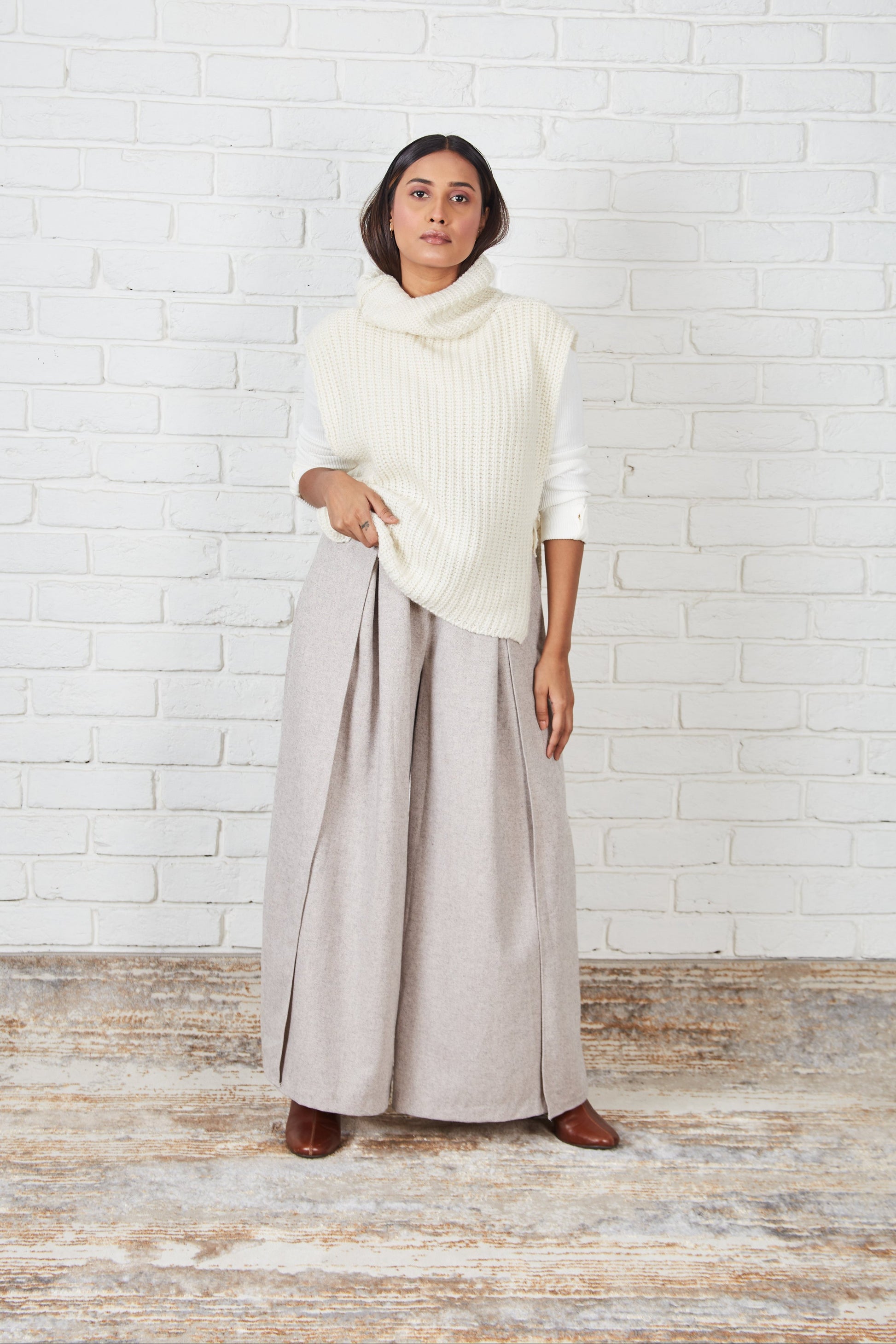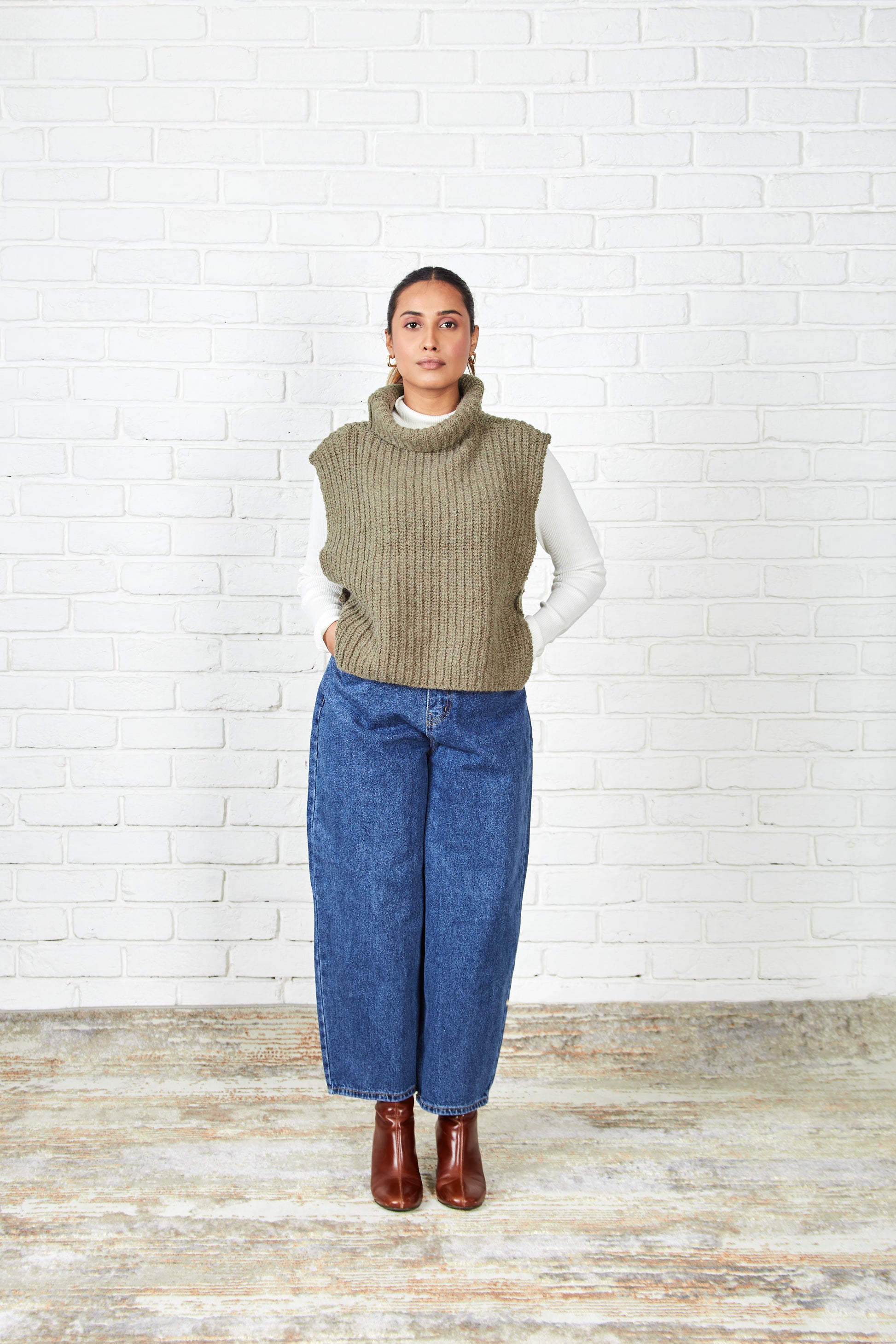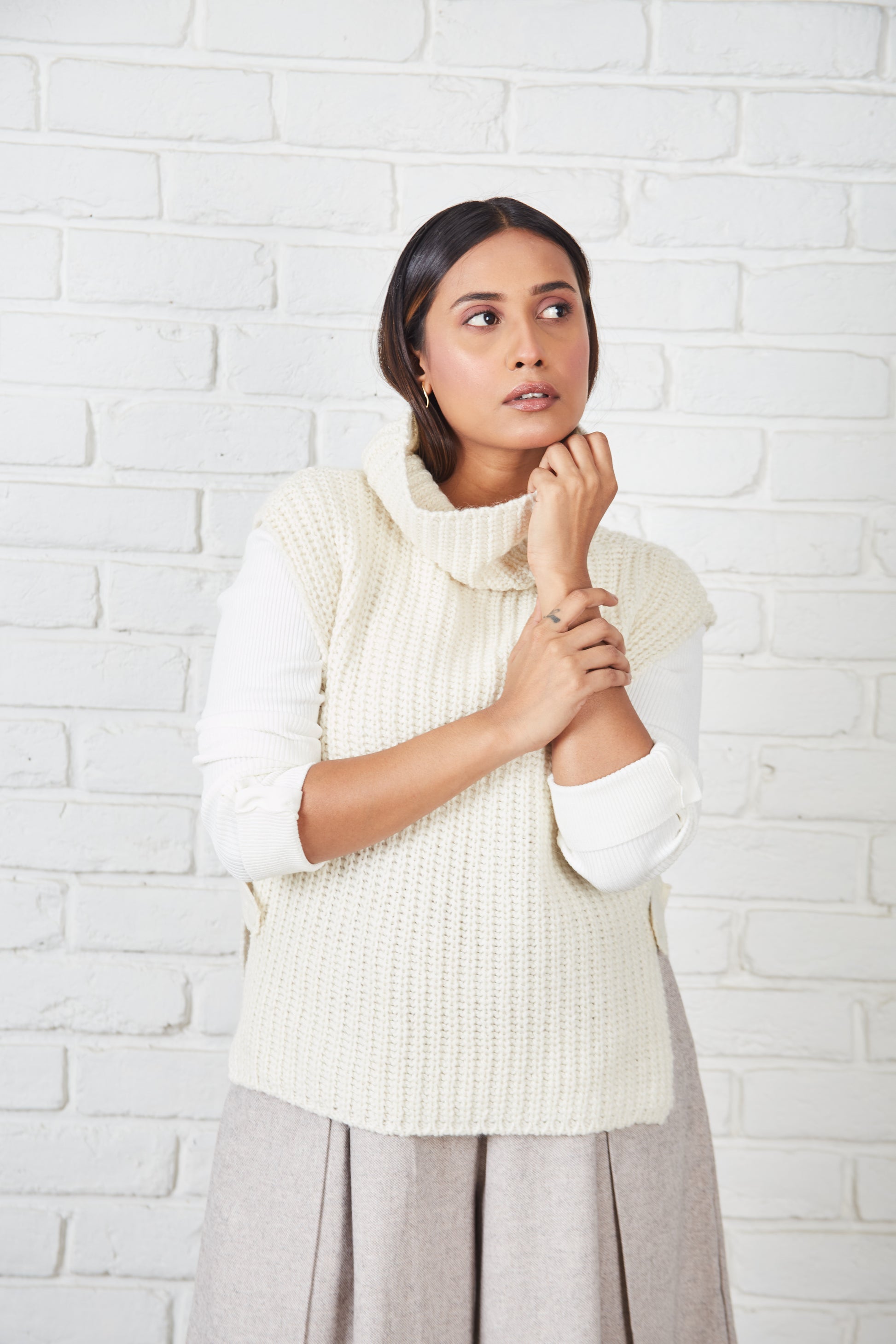 This fluffy, ribbed sleeveless turtleneck vest is meticulously crafted from very soft baby alpaca wool, offering an exquisite tactile experience. It is designed with an open side and sophisticated button fastenings, and gracefully drapes along the shoulders.