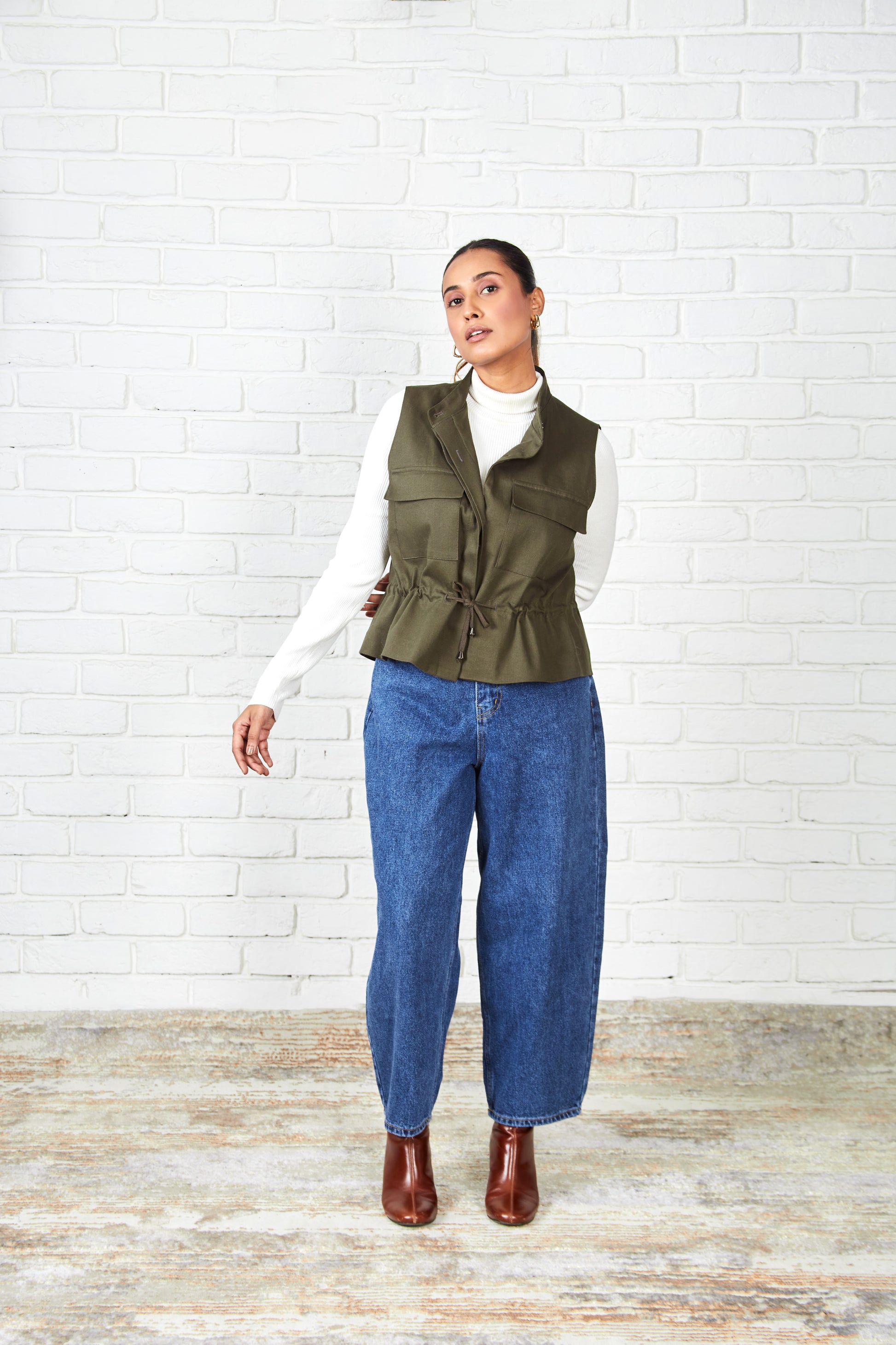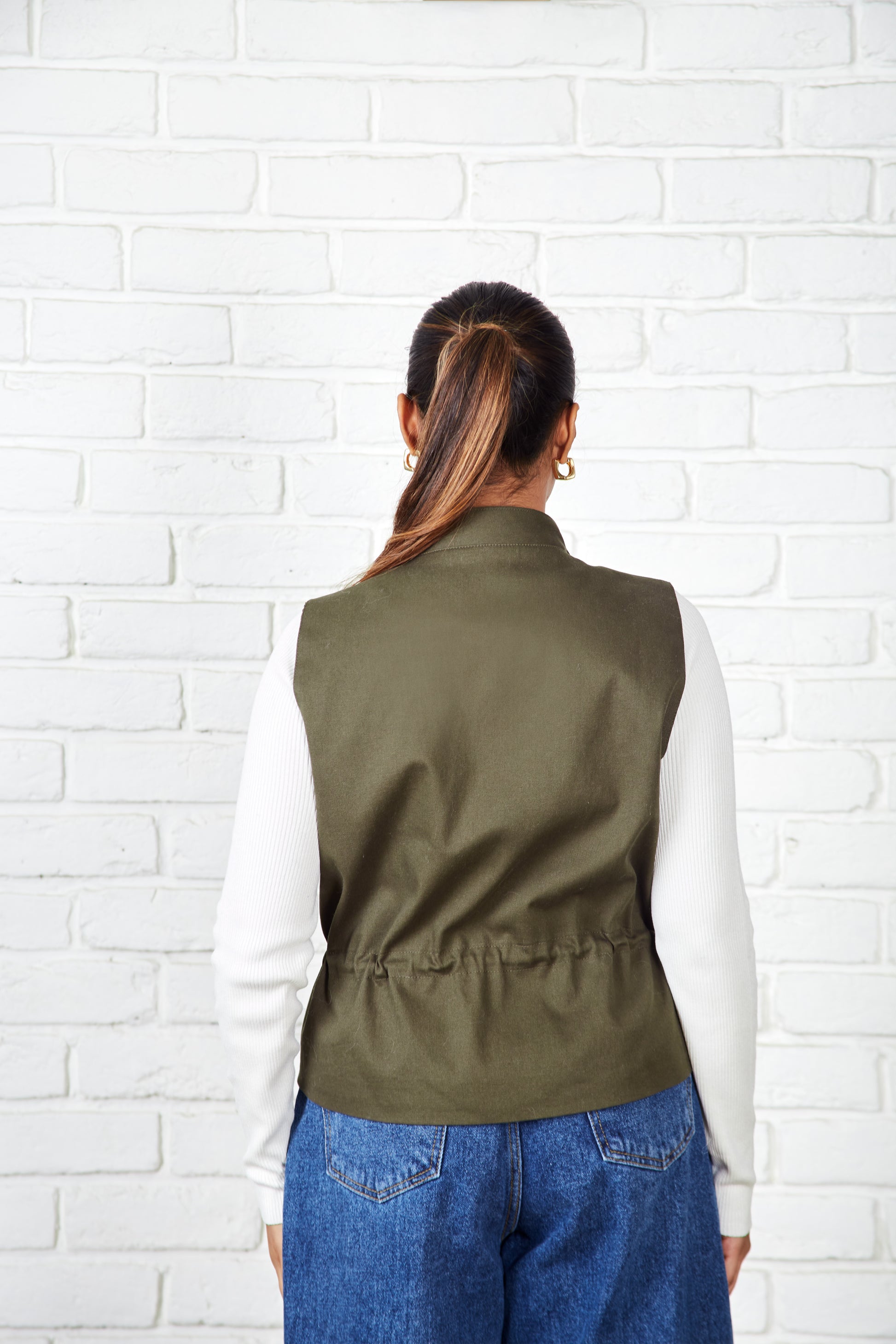This sleeveless piece features adjustable waist ties that can be fastened at the front, creating a subtle peplum silhouette. Designed with a sleek band collar and two front flap pockets, it has a button-front closure for a polished finish. It is perfect for layering, and pairs effortlessly over a shirt or under a jacket.